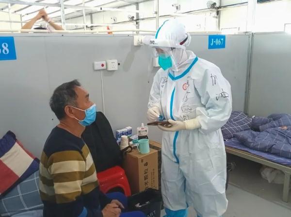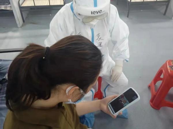 5月1日, 重慶市援滬醫療隊醫護職員與新進方艙的患者溝通身材情形。