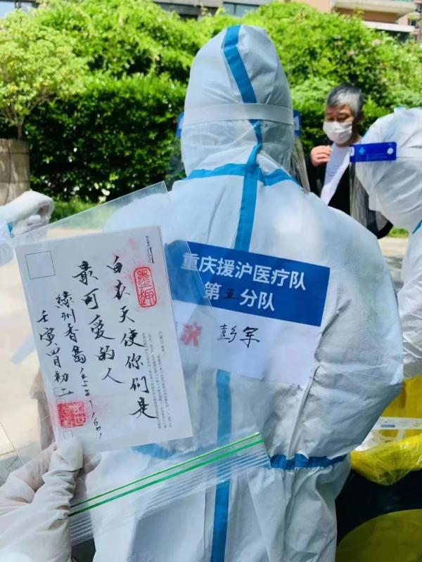 5月2日,采樣分隊彭軍在松江區九亭鎮綠洲噴鼻島小區停止核酸采樣,一名小女孩自動送來明信片,後背有手寫的“白衣天使你們是最心愛的人”。(邱超奕)